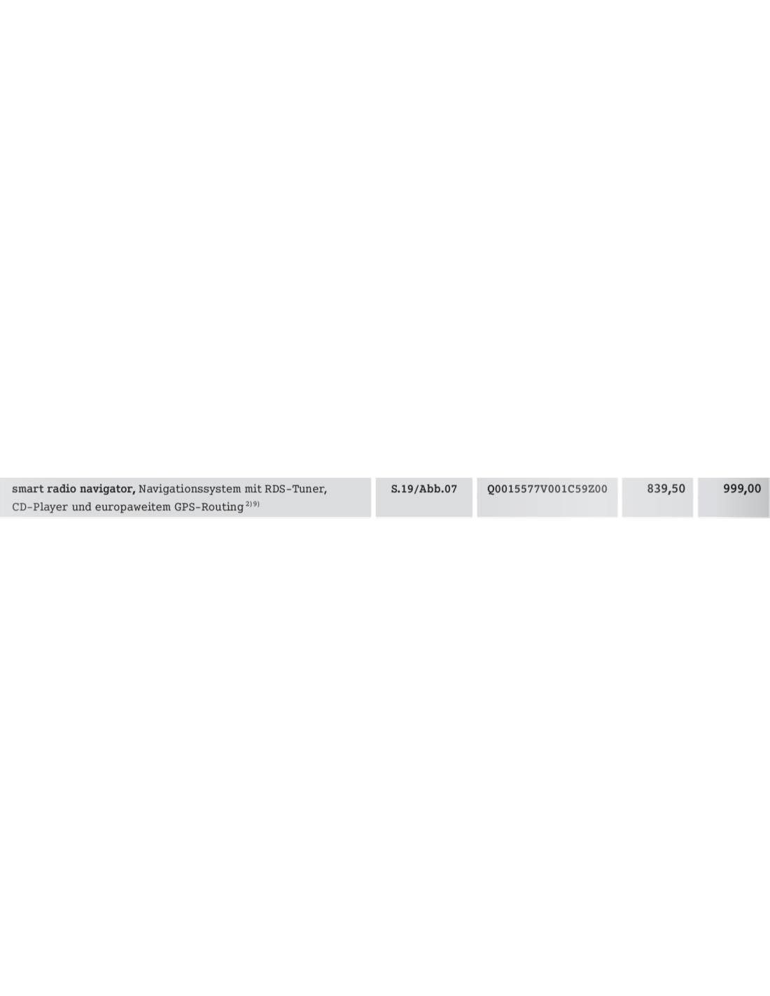 Das smart Navigationssystem bietet Radiofunktionen (UKW-, Kurzwellen-, Mittelwellen- und Langwellenempfang),einen CD-Player zum Abspielen von Audio-CDs und ein integriertes Navigationssystem mit gleichzeitiger Nutzung von Audio- und Navigationsfunktionen. CD-Laufwerk Über das integrierte CD-Laufwerk werden Audio-CDs und die Datenträger des Navigationssystems abgespielt. Multifunktionsdisplay Das Multifunktionsdisplay dient zur Visualisierung der Hauptfunktionen mit Richtungspfeilen, Buchstaben, Entfernungsangaben und schematischen Kreuzungsanzeigen. Sprachinformationen unterstützen die optischen Anzeigen und helfen Ihnen zusätzlich, schnell und problemlos ans Ziel zu gelangen.